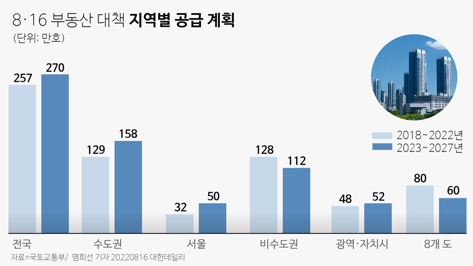 기준금리 인상과 경기 침체 우려 등으로 매수세가 크게 위축되어 하락상세를 이어가고 있는 주택시장에 8.16 대책은 추가적인 공급을 하겠다는 계획이기 때문에 매수세는 더욱 위축될 가능성이 있다. 3기 신도시처럼 서울 도심에서 출퇴근하기 어려운 지역이 아니라 도심 역세권 지역을 중심으로 민간이 공급하는 민간 도심복합개발사업을 특별법을 재정해서 진행한다고 하니 해당 사업이 준공업지역과 신규 정비구역 대상지역의 토지가격은 오히려 상승할 것으로 예상된다. 또한 강남과 양천, 노원 등 재건축 추진 단지가 몰려 있는 지역은 재건축부담금과 안전진단 제도에 대한 규제가 완화될 것으로 예상되는 만큼 하락장 속에서도 주택가격이 상승할 가능성도 있다.